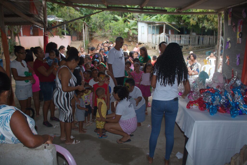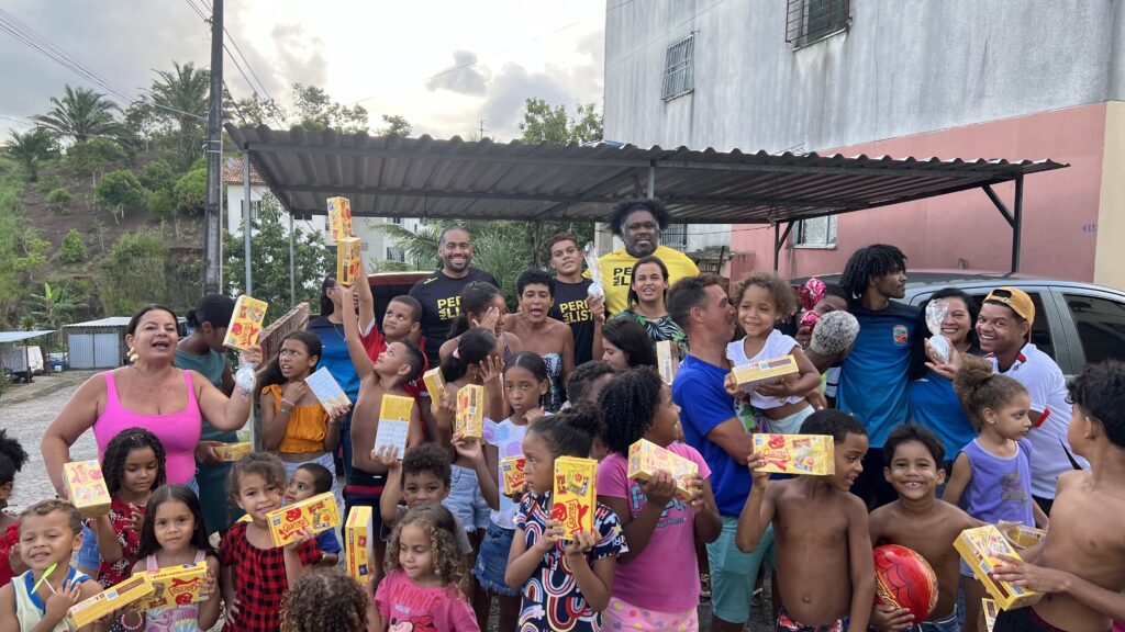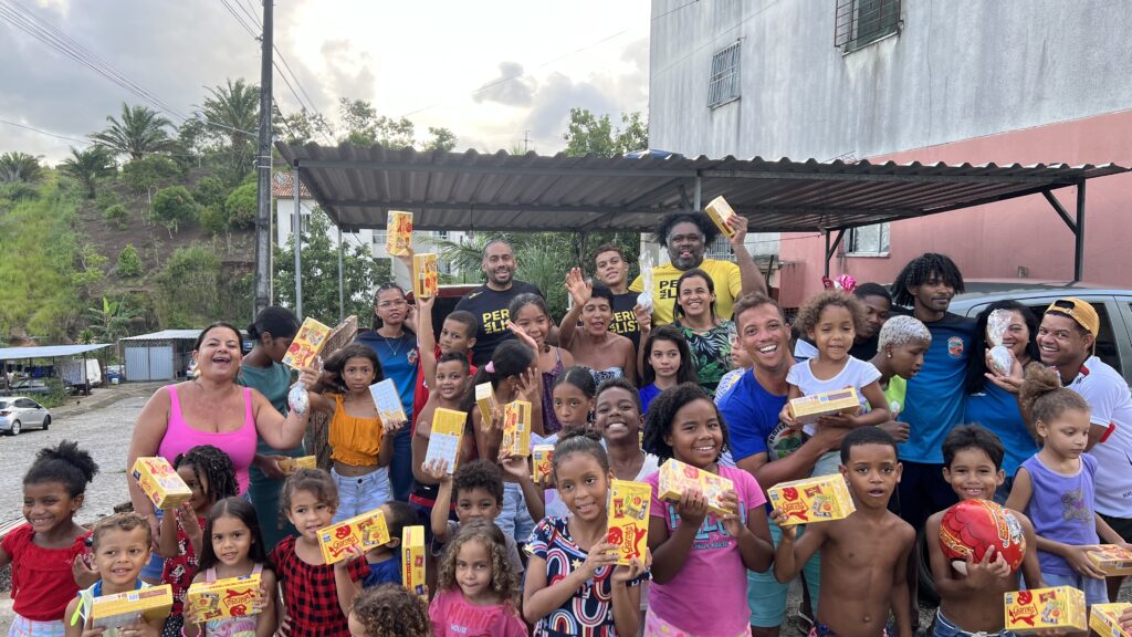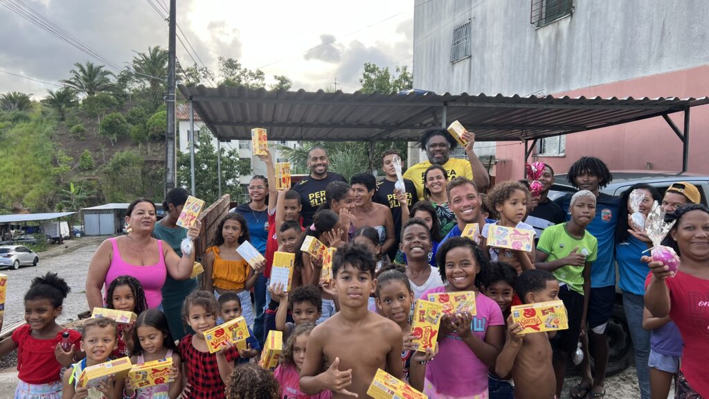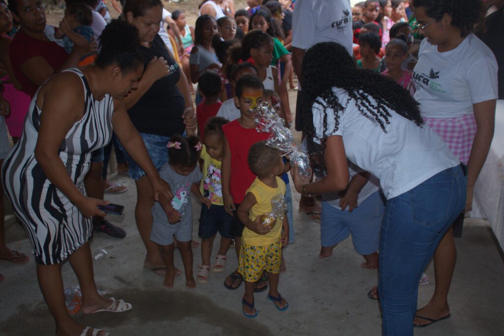 Nossa ação aconteceu em dois momentos: no sábado dia 4 de abril, realizamos a ação na Roça do povo, bairro rural da cidade de Itabuna. Neste dia, realizamos um cine, com exibição de um filme com o tema da páscoa, distribuição de lanches e de 100 ovos de páscoa, a ação aconteceu através de uma parceria dos nossos projetos com a Cufa Itabuna (@cufaitabunaa)